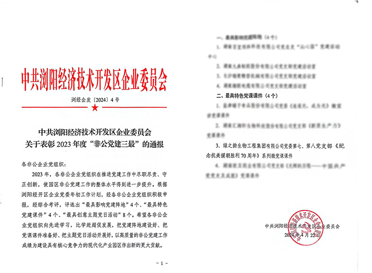推進會上,瀏陽經(jīng)開區(qū)企業(yè)黨委專職副書記陳飛雪作工作報告。瀏陽經(jīng)開區(qū)組織工作局局長宋孟宣讀了《關于表彰 2023 年度“非公黨建三最”的通報》。現(xiàn)場對“最具影響黨建陣地”“最具特色黨課課件”“最具創(chuàng)意主題黨日活動”獲獎單位進行了表彰。綠之韻集團黨委報送的《紀念抗美援朝勝利70周年》黨課課件獲評“最具特色黨課課件”。