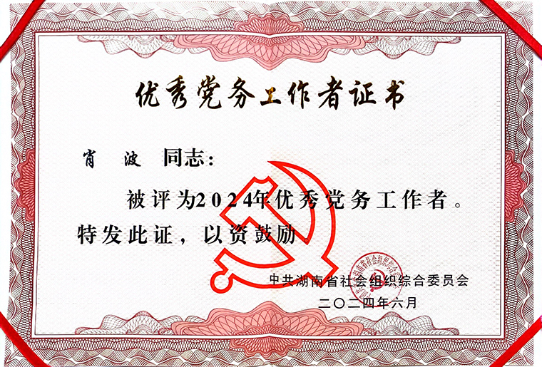 2024年6月27日,湖南省社會組織綜合黨委“七一”表彰暨省級社會組織評估等級授牌會議在長沙召開。會議宣讀了《中共湖南省社會組織綜合委員會關(guān)于表彰先進(jìn)基層黨組織、優(yōu)秀共產(chǎn)黨和優(yōu)秀黨務(wù)工作者的決定》,對湖南省20個社會組織先進(jìn)基層黨組織、10名優(yōu)秀共產(chǎn)黨和10名優(yōu)秀黨務(wù)工作者予以表彰獎勵。中共湖南省綠之韻公益基金會黨支部書記肖波獲評“中共湖南省社會組織綜合委員會優(yōu)秀黨務(wù)工作者”。