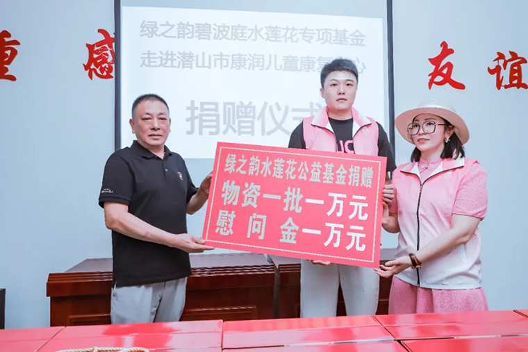 由綠之韻碧波庭傳承委朱浩齊葛慧霞伉儷代表綠之韻碧波庭水蓮花專項基金 ,向潛山市康潤兒童康復中心捐贈物資慰問金共計2萬元。