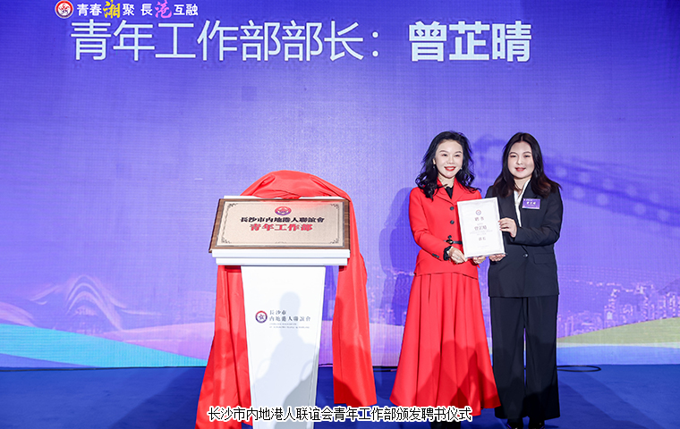 長沙市內(nèi)地港人聯(lián)誼會會長、湖南高橋大市場股份有限公司總經(jīng)理、華誼兄弟(長沙)電影文化城有限公司董事長羅曉發(fā)表致辭并宣布長沙市內(nèi)地港人聯(lián)誼會青年工作部正式成立。她表示,青年是國家的未來,是民族的希望,也是聯(lián)誼會不斷發(fā)展壯大的重要力量。成立青年工作部,是順應(yīng)時代需求、推動聯(lián)誼會事業(yè)持續(xù)發(fā)展的重要舉措。聯(lián)誼會將組織各類青年交流活動,促進(jìn)兩地青年在思想、文化、科技等方面的碰撞與融合,激發(fā)青年人的創(chuàng)新精神和創(chuàng)業(yè)熱情,推動青年工作部成為長沙與香港兩地青年交流合作的重要力量。她強調(diào),聯(lián)誼會一定不負(fù)眾望,以更加飽滿的熱情、更加扎實的工作作風(fēng)、更加創(chuàng)新的精神,為兩地的繁榮發(fā)展作出新的更大貢獻(xiàn)!隨后,中共湖南省委統(tǒng)戰(zhàn)部港澳臺處處長梁良與羅曉會長共同為青年工作部揭牌,并現(xiàn)場為青年部部長、常務(wù)副部長、副部長頒發(fā)聘書。