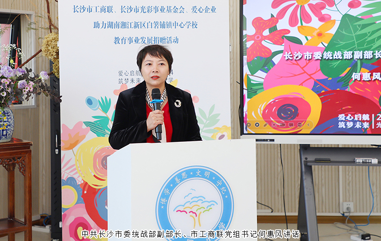 活動(dòng)最后,中共長(zhǎng)沙市委統(tǒng)戰(zhàn)部副部長(zhǎng)、市工商聯(lián)黨組書記何惠風(fēng)講話。她向參加此次捐贈(zèng)活動(dòng)的企業(yè)家表示衷心感謝。她強(qiáng)調(diào),教育是民族振興、社會(huì)進(jìn)步的重要基石,是功在當(dāng)代、利在千秋的德政工程。一直以來,湖南省長(zhǎng)沙市光彩事業(yè)基金會(huì)和廣大民營(yíng)企業(yè)家都心系教育、真心幫扶。此次活動(dòng),湖南省長(zhǎng)沙市光彩事業(yè)基金會(huì)的愛心企業(yè)家為學(xué)校送來了智能教學(xué)及基礎(chǔ)教學(xué)設(shè)備,這不僅是物質(zhì)上的關(guān)心與支持,更是精神上的鼓舞與激勵(lì)。我們期待發(fā)揮民營(yíng)企業(yè)的資源優(yōu)勢(shì),推動(dòng)科技與教育深度鏈接,不斷擴(kuò)大優(yōu)質(zhì)教育資源的覆蓋面和共享度,努力為學(xué)生鋪開“筑夢(mèng)之路”、點(diǎn)燃“希望之火”,愿校企攜手合作,共繪多彩教育新畫卷。她表示,愛心助學(xué)只有進(jìn)行時(shí),沒有完成時(shí),需要社會(huì)各界長(zhǎng)期關(guān)注和持續(xù)努力。希望湖南省長(zhǎng)沙市光彩事業(yè)基金會(huì)始終秉持“義利兼顧、以義為先,自強(qiáng)不息、止于至善”的光彩精神,廣泛匯聚各方愛心資源,持續(xù)助力教育事業(yè)高質(zhì)量發(fā)展。希望廣大民營(yíng)企業(yè)家繼續(xù)投身關(guān)心教育、關(guān)愛學(xué)子的民心工程,持續(xù)開展奉獻(xiàn)愛心、凝聚信心的真情善舉。