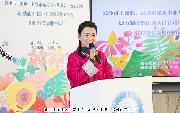 活動(dòng)由湖南湘江新區(qū)白箬鋪鎮(zhèn)中心學(xué)校書記、校長(zhǎng)向慧主持。活動(dòng)伊始,中共湖南湘江新區(qū)白箬鋪鎮(zhèn)黨委書記毛柯致辭。他首先代表白箬鋪鎮(zhèn)向長(zhǎng)沙市工商聯(lián)、湖南省長(zhǎng)沙市光彩事業(yè)基金會(huì)以及各位愛心企業(yè)家的慷慷慨捐贈(zèng)表示衷心的感謝。這是對(duì)白箬鋪鎮(zhèn)教育事業(yè)的極大鼓舞和鞭策,更是對(duì)全鎮(zhèn)師生的巨大激勵(lì)和鼓舞。希望廣大教育工作者繼續(xù)把教育當(dāng)作最偉大的事業(yè),把講臺(tái)當(dāng)做最精彩的舞臺(tái),讓學(xué)生成功、成長(zhǎng)、成才,讓自己的人生和事業(yè)更加出彩。衷心期盼各位領(lǐng)導(dǎo)和愛心企業(yè)家一如既往的關(guān)心支持白箬鋪鎮(zhèn)教育事業(yè)的發(fā)展。