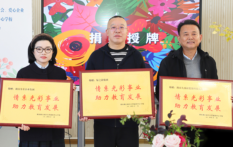 百年大計(jì),教育為本。捐贈(zèng)儀式上,愛心企業(yè)向?qū)W校捐贈(zèng)愛心支票。此次,綠之韻集團(tuán)共計(jì)向湖南省長(zhǎng)沙市光彩事業(yè)基金會(huì)捐資40萬元助力光彩事業(yè)。活動(dòng)現(xiàn)場(chǎng),綠之韻集團(tuán)董事長(zhǎng)胡國(guó)安向湖南湘江新區(qū)白箬鋪鎮(zhèn)中心小學(xué)捐贈(zèng)10萬元用于購置教學(xué)設(shè)備。隨后,白箬鋪鎮(zhèn)中心學(xué)校、光明小學(xué)、仁和小學(xué)、古沖小學(xué)、金城幼兒園向愛心企業(yè)回贈(zèng)愛心牌匾。