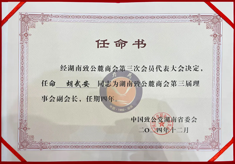 此次當(dāng)選為湖南致公麓商會副會長,胡武安副總經(jīng)理表示:這不僅是一種光榮,更是一份沉甸甸的責(zé)任。未來,他將秉持“致力為公、僑海報國”的宗旨,發(fā)揮自身優(yōu)勢,盡職盡責(zé),將自身及企業(yè)的發(fā)展同國家發(fā)展、經(jīng)濟(jì)社會發(fā)展緊密結(jié)合,在致公黨湖南省委會的領(lǐng)導(dǎo)下、在新一屆理事會的帶領(lǐng)下、與各位優(yōu)秀的民營企業(yè)家們一道,發(fā)揮好橋梁紐帶作用,為商會的發(fā)展出謀劃策,為會員企業(yè)提供更好的服務(wù);積極帶領(lǐng)企業(yè)履行社會責(zé)任,進(jìn)一步凝聚致公力量,立足新起點,實現(xiàn)新發(fā)展,再創(chuàng)新輝煌。