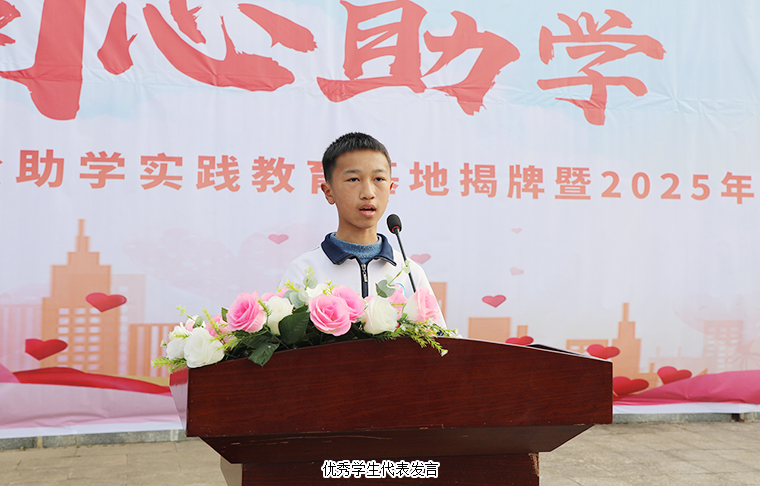 中共安化縣委副書(shū)記、統(tǒng)戰(zhàn)部部長(zhǎng)代虹宇致歡迎辭。他首先對(duì)一直大力支持教育事業(yè)的綠之韻集團(tuán)愛(ài)心團(tuán)隊(duì)給予高度贊許。同時(shí)表示,2021年,致公黨湖南省委員會(huì)與我縣簽訂《助力鄉(xiāng)村振興戰(zhàn)略“致安合作”框架協(xié)議》,通過(guò)產(chǎn)業(yè)幫扶、教育助學(xué)、醫(yī)療義診等務(wù)實(shí)舉措,累計(jì)投入幫扶資金860萬(wàn)元,實(shí)施項(xiàng)目 23個(gè),為安化鄉(xiāng)村振興注入強(qiáng)勁動(dòng)能。胡國(guó)安董事長(zhǎng)設(shè)立“綠韻圓夢(mèng)”獎(jiǎng)教獎(jiǎng)學(xué)金,已經(jīng)連續(xù)三年每年向?qū)W校捐贈(zèng)人民幣10萬(wàn)元整,累計(jì)惠及師生420人次,彰顯了新時(shí)代企業(yè)家的教育情懷和責(zé)任擔(dān)當(dāng)。安化大橋?qū)W校作為冷市鎮(zhèn)教育的窗口,近年來(lái)在各方支持下,辦學(xué)條件顯著改善,教學(xué)質(zhì)量穩(wěn)步提升。今天實(shí)踐教育基地揭牌,既是總結(jié)更是啟航。期盼學(xué)校深化合作,在課程共建、師資培育等方面創(chuàng)新突破,打造鄉(xiāng)村教育振興示范樣本。希望同學(xué)們立鴻鵠志、做追夢(mèng)人,將感恩之心轉(zhuǎn)化為“強(qiáng)國(guó)有我”的奮斗力量,讓青春在傳遞愛(ài)心中綻放光彩。讓我們以此次活動(dòng)為新起點(diǎn),凝聚各方力量,厚植教育情懷,持續(xù)推動(dòng)城鄉(xiāng)教育優(yōu)質(zhì)均衡發(fā)展,為鄉(xiāng)村振興培育更多生力軍。