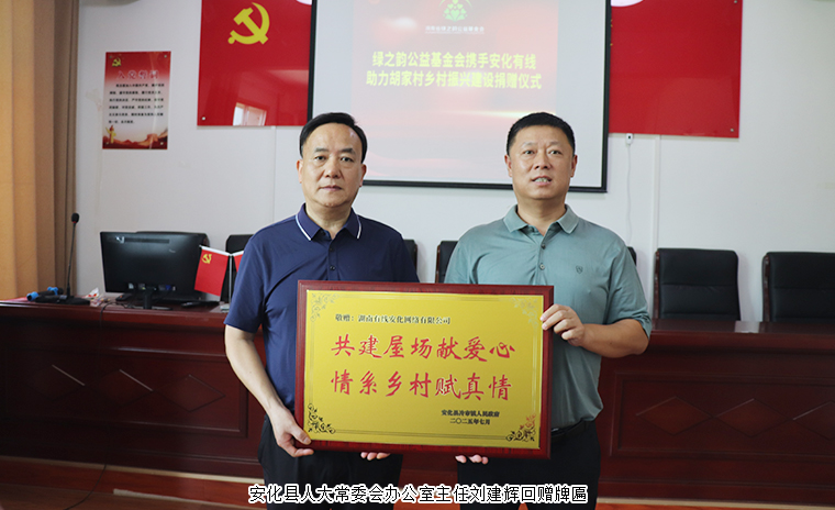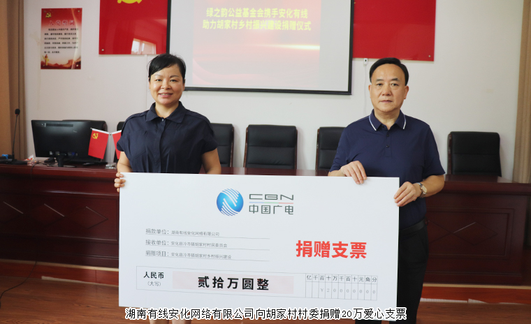 捐贈儀式現(xiàn)場暖意融融,綠之韻集團(tuán)常務(wù)副總裁胡均安代表綠之韻公益基金會向胡家村村委遞上25萬元愛心支票;湖南有線安化網(wǎng)絡(luò)有限公司董事長陳社平亦向村委捐贈20萬元愛心款,兩份沉甸甸的善意凝聚著對鄉(xiāng)村發(fā)展的深切關(guān)懷。安化縣人大常委會黨組書記陳飛燕和安化縣人大常委會辦公室主任劉建輝代表受助方回贈愛心牌匾,以作銘記與致謝。“捐資助學(xué)潤桃李,鄉(xiāng)村振興報桑梓”這句飽含溫度的話語,正是胡家村全體村民對綠之韻等愛心力量善舉的最誠摯回響。