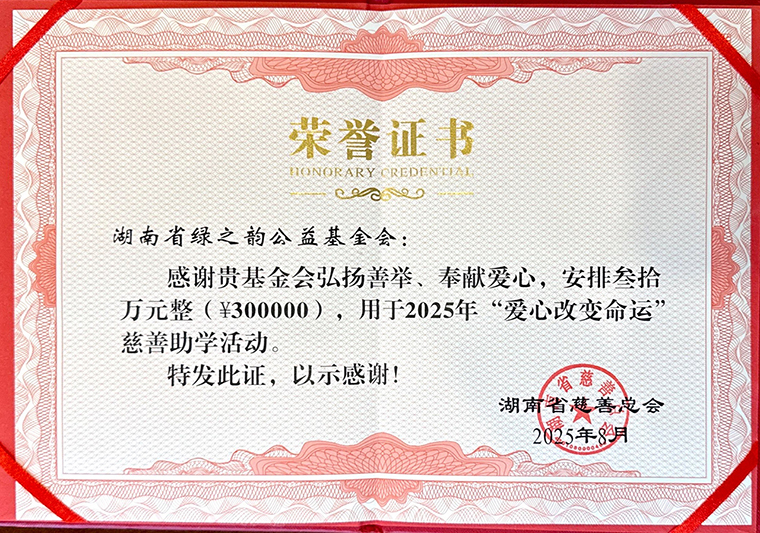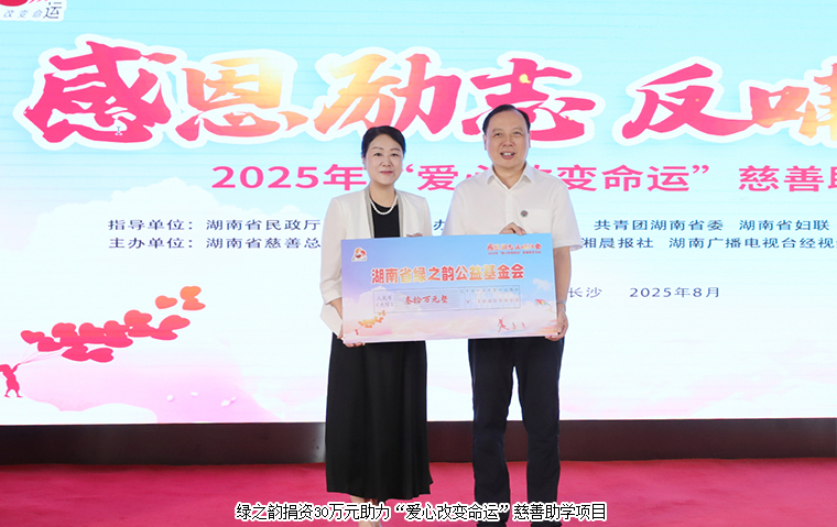 知識(shí)改變命運(yùn),愛心鑄就未來。愛心企業(yè)、愛心單位線上線下齊發(fā)力。今年8月,綠之韻公益基金會(huì)攜手湖南省慈善總會(huì)、芒果公益平臺(tái)開啟“愛心改變命運(yùn)”助學(xué)季,上線“2025愛心改變命運(yùn)”網(wǎng)絡(luò)籌款募捐項(xiàng)目,向社會(huì)籌措助學(xué)資金,資助湖南省內(nèi)勵(lì)志學(xué)子圓夢(mèng)大學(xué)。此次活動(dòng)現(xiàn)場(chǎng),勞嘉總裁代表綠之韻集團(tuán)向“愛心改變命運(yùn)”項(xiàng)目捐資30萬,為圓勵(lì)志學(xué)子大學(xué)夢(mèng)貢獻(xiàn)一份力量。