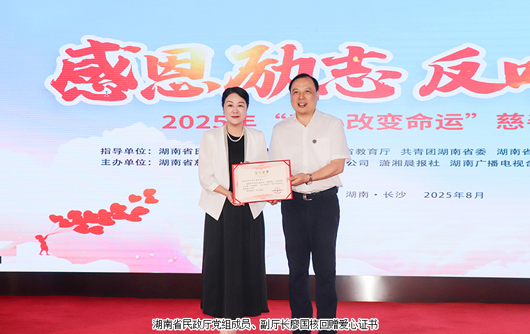 8月28日,2025年“愛心改變命運(yùn)”慈善助學(xué)活動(dòng)在長(zhǎng)沙舉行。湖南省慈善總會(huì)會(huì)長(zhǎng)黃蘭香,湖南省民政廳廳長(zhǎng)黃東紅,湖南省民政廳黨組成員、副廳長(zhǎng)廖國核,湖南省婦聯(lián)一級(jí)巡視員盧妹香,湖南省老干部局二級(jí)巡視員彭小平等領(lǐng)導(dǎo)嘉賓出席活動(dòng)。湖南省政協(xié)委員、綠之韻集團(tuán)總裁、綠之韻公益基金會(huì)理事長(zhǎng)勞嘉受邀參加活動(dòng)。