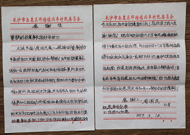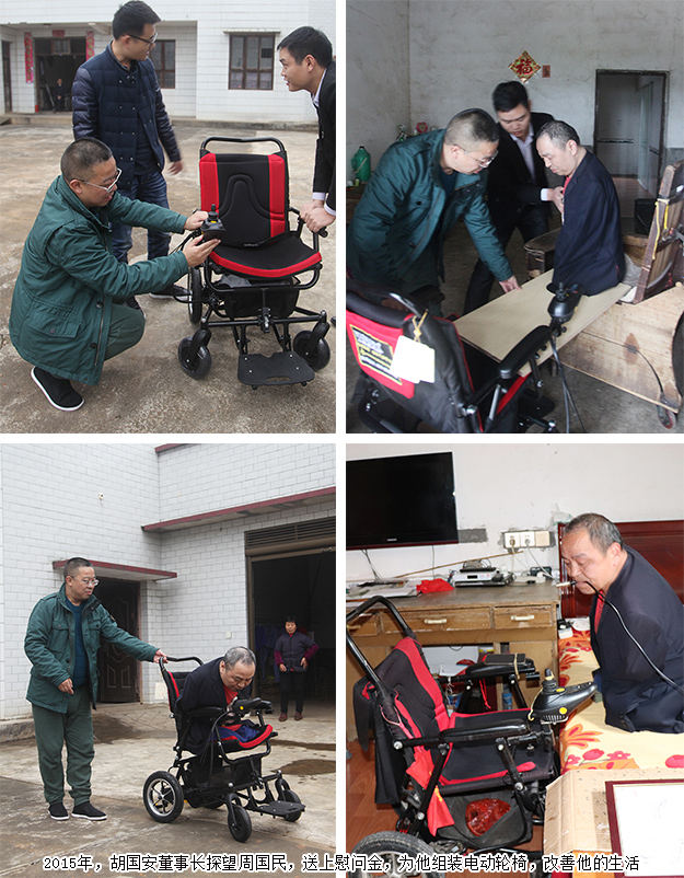 書桌前畫畫、寫字磨過了他大半輩子的時光,四季輪回更迭,周國民愈加向往外面的世界,渴望更真實地去感受陽光和風,渴望與更多人交流,感受這個世界的溫度。2015年11月,綠之韻公益基金會得知這一情況,為周國民送去了電動輪椅。胡國安董事長親自去探望周國民,將輪椅組裝好,并耐心指導他使用,圓了他的自由行動夢。