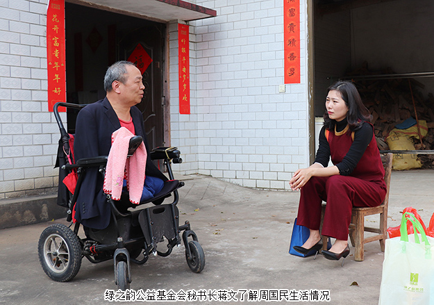 溫暖四月,萬樹繁花。綠之韻公益基金會秘書長蔣文、副秘書長肖波與綠之韻愛心志愿者再次來到長沙望城縣興豐村周國民的家。伴隨著春天的和風與溫暖的陽光,迎接我們的是周國民燦爛的笑臉。與五年前相比,周國民開朗了很多,眼里閃著激動的光,一直說著感謝的話。“感謝綠之韻,感謝胡國安董事長,是你們給了我尊嚴和自由,給了我第二次生命。”