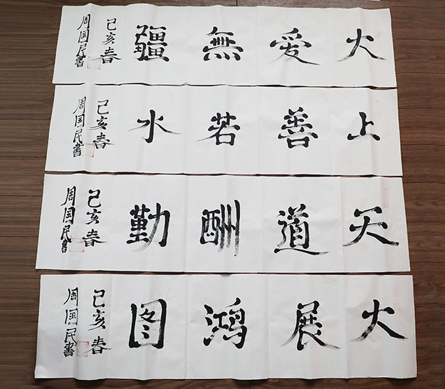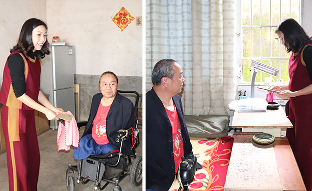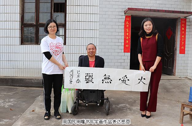 “感謝五年前胡國安董事長的鼓勵,現(xiàn)在我用嘴寫的書畫作品已經(jīng)成熟很多,我想為胡國安董事長送去我的字畫,表達我的感謝與感激。”上善若水、大愛無疆、大展鴻圖、大道酬勤……一幅幅字畫都是周國民的心聲。綠之韻公益基金會秘書長蔣文代表胡國安董事長接過這份沉甸甸的心意禮物,并在了解周國民現(xiàn)在家中80多歲的老父親已經(jīng)中風偏癱,母親年事已高但照顧著家中大小事情,不僅送去了慰問金和綠之韻生活用品,還專門購置了電飯煲、電磁爐和微波爐等電器,為周國民一家提供更多便利生活。