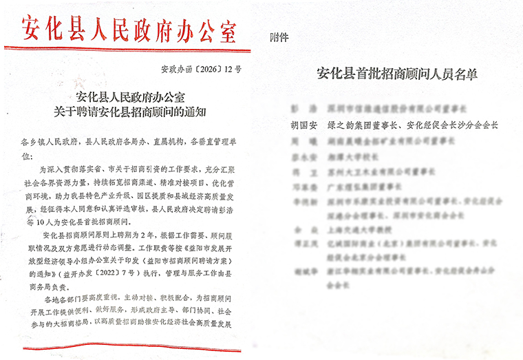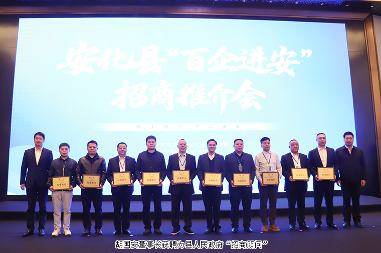 鄉(xiāng)友回歸,既要引得來,更要留得住、發(fā)展好;產(chǎn)業(yè)振興,既要搭平臺(tái),更要聚人才、強(qiáng)支撐。為進(jìn)一步匯聚鄉(xiāng)賢力量、拓寬招商渠道,本次招商推介會(huì)上,安化縣專門聘任10位各界精英擔(dān)任 “招商顧問”,以商引商、以情聚商,為家鄉(xiāng)高質(zhì)量發(fā)展注入更強(qiáng)動(dòng)能。長(zhǎng)沙市安化商會(huì)會(huì)長(zhǎng)、綠之韻集團(tuán)董事長(zhǎng)胡國(guó)安憑借深厚的家鄉(xiāng)情懷、廣泛的行業(yè)影響力與豐富的資源優(yōu)勢(shì),獲聘為安化縣人民政府“招商顧問”。