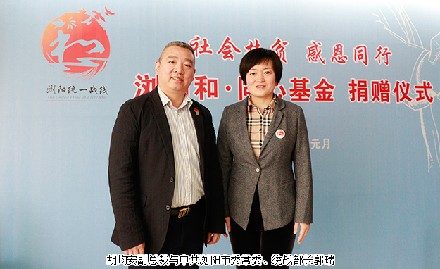 捐贈座談會由中共瀏陽市委統(tǒng)戰(zhàn)部常務副部長焦清平作活動主持。會上,瀏陽市安監(jiān)局黨組書記、局長熊湘東宣讀“瀏陽和·同心基金”捐贈倡議書,發(fā)出愛的倡議:“社會扶貧,統(tǒng)一戰(zhàn)線一直在行動。成立社會扶貧‘瀏陽和·同心基金’旨在凝聚各方力量,匯聚各界愛心,大力發(fā)揚團結(jié)奮進、互助友愛的精神和作風,用愛心和真情澆灌社會扶貧工作,積極行動起來、彰顯同心之為,主動擔當起來、奉獻同心之力。涓流共匯,綿力齊聚,點滴善舉,將讓陽光照進貧困者夢想,讓社會扶貧‘瀏陽和·同心基金’大放光彩!”隨后,各愛心企業(yè)上臺一一進行捐贈,綠之韻集團副總裁胡均安代表綠之韻集團上臺進行愛心捐贈。