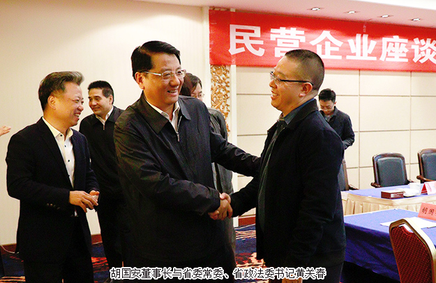 2018年12月4日,湖南省委統(tǒng)戰(zhàn)部、省委政法委組織召開民營企業(yè)座談會。湖南省委常委、省政法委書記黃關(guān)春,湖南省委常委、省委統(tǒng)戰(zhàn)部部長黃蘭香,湖南省政協(xié)副主席、省工商聯(lián)主席張健,湖南省高級人民法院黨組書記、院長田文立,湖南省人民檢察院黨組書記、檢察長游勸榮等領(lǐng)導(dǎo)出席座談會。第十二屆省政協(xié)委員、湖南省工商聯(lián)(總商會)副會長、綠之韻集團董事長胡國安受邀參會。