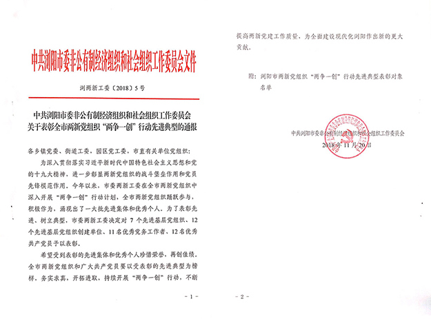 瀏陽市委兩新工委在全市兩新黨組織中組織開展“兩爭一創(chuàng)”行動(dòng)先進(jìn)典型評(píng)選,旨在深入貫徹落實(shí)新時(shí)代中國特色社會(huì)主義思想和黨的十九大精神,彰顯兩新黨組織戰(zhàn)斗堡壘作用和黨員先鋒模范作用。湖南綠之韻保健日用品有限公司黨支部憑借出色的黨建工作,經(jīng)基層推薦、差額比選、組織考察、綜合會(huì)審,并經(jīng)市委兩新工委會(huì)議研究,被評(píng)為瀏陽市兩新黨組織“兩爭一創(chuàng)”行動(dòng)“先進(jìn)基層黨組織創(chuàng)建單位”,中共瀏陽市委常委、組織部部長周文舜給獲獎(jiǎng)的先進(jìn)集體頒獎(jiǎng)。