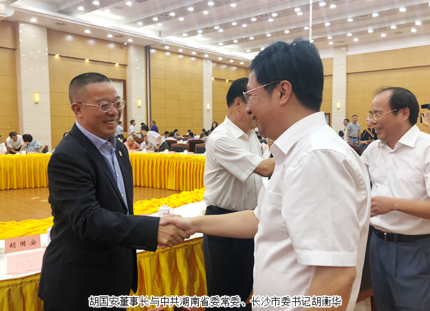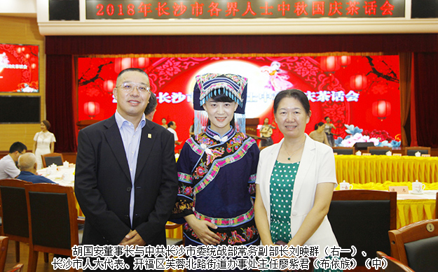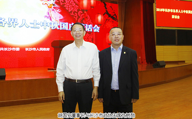 2018年9月21日,長沙市各界人士中秋國慶茶話會在市委會議中心舉行。中共湖南省委常委、長沙市委書記胡衡華,中共長沙市委副書記徐宏源,長沙市人大常委會主任程水泉,長沙市政協(xié)主席文樹勛,中共長沙市委常委、市委統(tǒng)戰(zhàn)部長譚小平等領(lǐng)導(dǎo)與全市離退休老同志、各界人士齊聚一堂,共慶佳節(jié),共話發(fā)展。湖南省政協(xié)委員,香港長沙聯(lián)誼會榮譽會長,香港長沙商會常務(wù)副會長,綠之韻集團(tuán)董事長胡國安受邀參加茶話會。