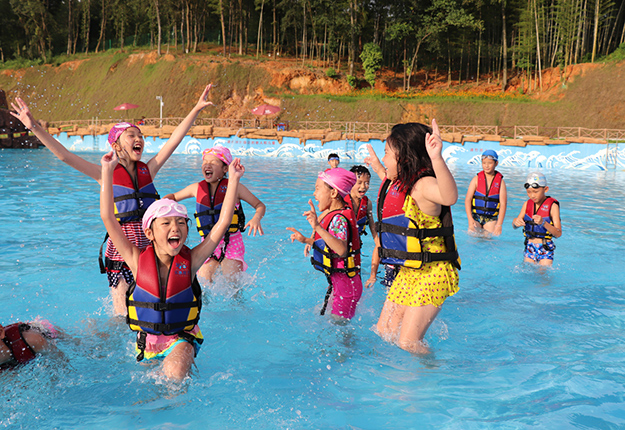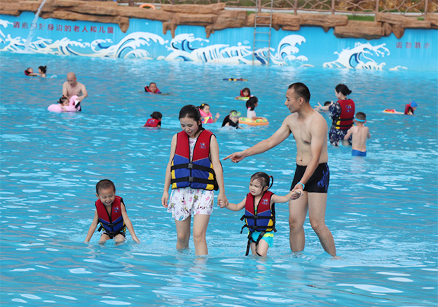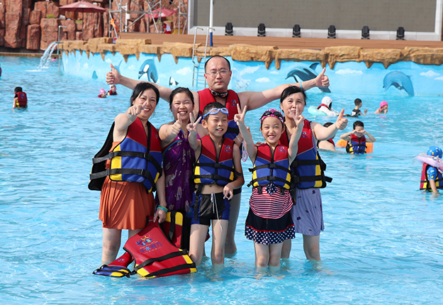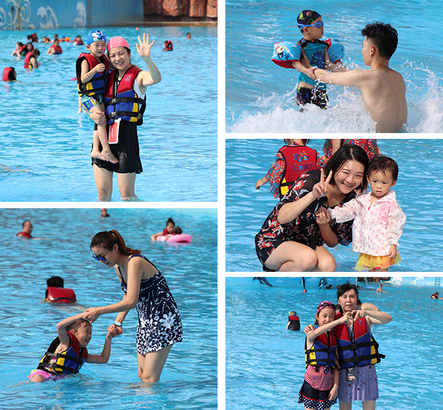 來(lái)到園內(nèi),家人們換上了美美的泳裝與孩子們?cè)谒墟覒颉T谒刂校憧梢钥吹綃寢尷畠旱氖郑职咽纸毯⒆討?zhàn)勝恐懼學(xué)會(huì)游泳;浪潮涌來(lái),爸爸守在孩子身后,緊緊抱住孩子的腰,成為寶貝最堅(jiān)強(qiáng)的護(hù)盾;爸爸與女兒從水中上來(lái),地面被烈日曬得滾燙,爸爸讓女兒踩在自己的腳上一步一步向前走……家人們與孩子在水中盡情享受著這難得的悠閑下午時(shí)光。