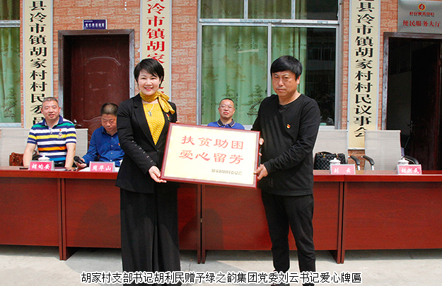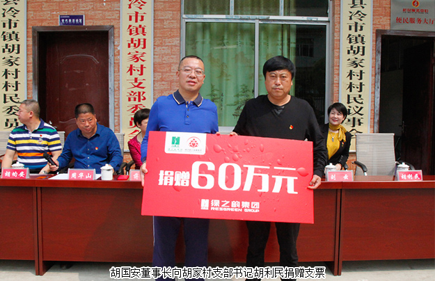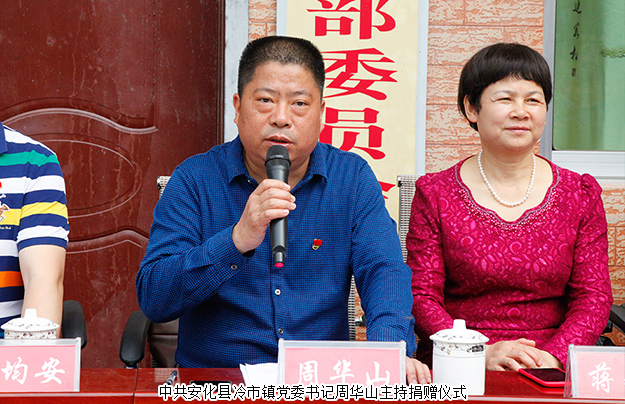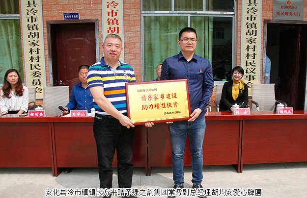 捐贈(zèng)儀式由中共安化縣冷市鎮(zhèn)黨委書記周華山主持。活動(dòng)伊始,中共安化縣冷市鎮(zhèn)黨委副書記、鎮(zhèn)長(zhǎng)方平向大家簡(jiǎn)單介紹了胡家村的發(fā)展和扶貧情況。他在講話中對(duì)胡國(guó)安董事長(zhǎng)飲水思源,回饋家鄉(xiāng)的善舉,對(duì)綠之韻集團(tuán)精準(zhǔn)扶貧、回報(bào)桑梓的高尚情操表示了高度的肯定與贊許。他表示,冷市鎮(zhèn)委、胡家村村委一定會(huì)懷著感恩的心態(tài),將這筆善款用到胡家村的基礎(chǔ)設(shè)施建設(shè)當(dāng)中,將胡國(guó)安董事長(zhǎng)的愛心善舉發(fā)揮出更大的效益。隨后 ,胡家村支部書記胡利民向大家匯報(bào)了用于修建公路的捐贈(zèng)款的使用情況。湖南省政協(xié)委員、湖南省工商聯(lián)(總商會(huì))副會(huì)長(zhǎng)、綠之韻集團(tuán)董事長(zhǎng)胡國(guó)安向胡家村村委會(huì)捐贈(zèng)60萬元款物支票。中共安化縣冷市鎮(zhèn)鎮(zhèn)長(zhǎng)方平、胡家村支部書記胡利民代表冷市鎮(zhèn)政府分別向綠之韻集團(tuán)常務(wù)副總經(jīng)理胡均安、黨委書記劉云頒發(fā)了愛心捐贈(zèng)牌匾。