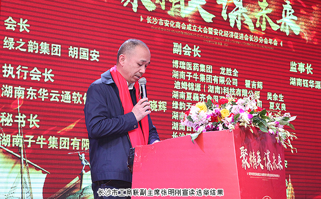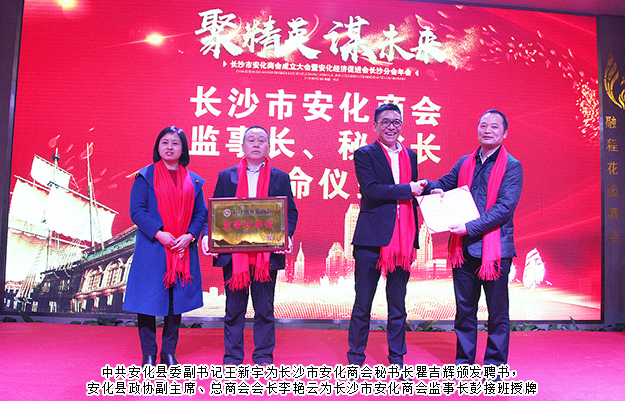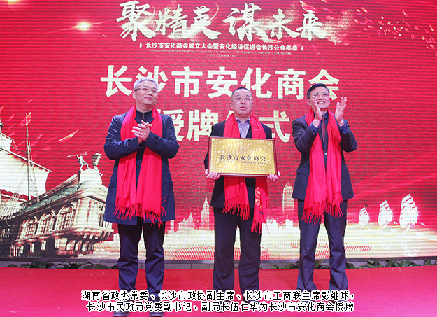 為了更好的加強安化籍企業(yè)家,鄉(xiāng)賢的相互聯(lián)系,更好的整合資源,打造溝通交流的平臺,實現(xiàn)合作共贏,進一步提升安化的影響力,增強安化人的影響力和凝聚力,安化商會應(yīng)運而生。湖南省政協(xié)常委、長沙市政協(xié)副主席、長沙市工商聯(lián)主席彭繼球宣讀商會選舉結(jié)果。綠之韻集團董事長胡國安當選長沙市安化商會會長,夏曉輝當選執(zhí)行會長,龍勝全、吳余生、夏義良、諶獻軍等當選副會長。與會領(lǐng)導為新當選的會長、執(zhí)行會長、監(jiān)事長授牌。同時,為了表彰為安化發(fā)展做出貢獻的杰出代表,大會授予盧虎行等八位安化籍代表“特殊貢獻獎”,安化經(jīng)濟促進會長沙分會理事長李蒲初先生為獲獎代表頒獎。