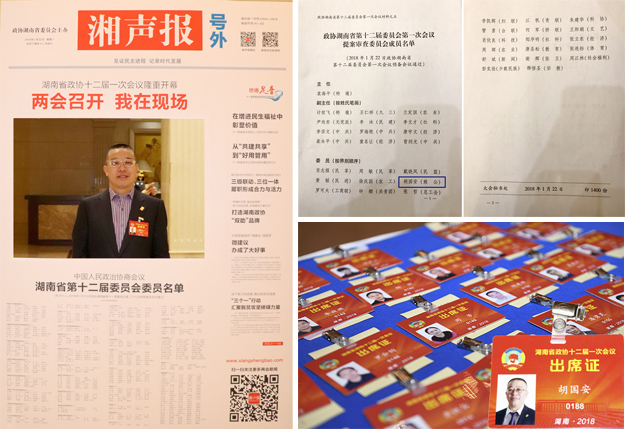 “他剛從苦難中走出來,轉(zhuǎn)身就把手伸向了后面的人。在他看來,財富僅僅是一個有增有減的數(shù)字,責(zé)任才是生命中最重要的擔(dān)當(dāng)。”這是2016年胡國安委員榮獲“CCTV感動中國之感動湖南人物”的頒獎詞,也是他甘于奉獻、建言履職的最生動注腳。作為一名三屆“老委員”,胡國安任職第十、第十一屆政協(xié)委員期間,深入廣泛調(diào)研,積極建言獻策,曾先后提交了《關(guān)于推進“互聯(lián)網(wǎng)+扶貧”模式,實施精準(zhǔn)扶貧的建議》《關(guān)于加速推進慈善事業(yè)立法的相關(guān)建議》《關(guān)于加快我省推進電子商務(wù)進農(nóng)村的幾點合理化建議》《關(guān)于加速推進湖南省電商網(wǎng)商發(fā)展的幾點建議》《關(guān)于加強互聯(lián)網(wǎng)管理、遏制網(wǎng)絡(luò)謠言的合理化建議》等20多件提案,涉及精準(zhǔn)扶貧、關(guān)愛青少年、電子商務(wù)、互聯(lián)網(wǎng)+、公益事業(yè)、綠色健康、低碳環(huán)保等多個社會層面,得到了省委省政府及相關(guān)部門、媒體的重視和贊譽。其中,胡國安委員在政協(xié)湖南省第十屆委員會第四次會議上代表無黨派人士的發(fā)言《積極引導(dǎo)非公有制經(jīng)濟融入“四化兩型”戰(zhàn)略的建議》受到最高人民法院院長(時任中共湖南省委書記)周強的重要批示,并被評為“優(yōu)秀政協(xié)委員”;在政協(xié)湖南省第十一屆委員會第五次會議上,所提交的提案《關(guān)于推進“互聯(lián)網(wǎng)+扶貧”模式,實施精準(zhǔn)扶貧的建議》被省政協(xié)表彰為“優(yōu)秀提案”。