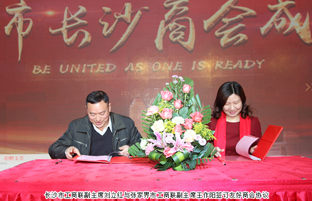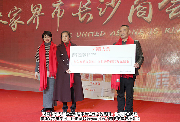 大會上,綠之韻集團黨委書記劉云、長沙市工商聯(lián)經(jīng)濟聯(lián)絡(luò)處處長黃羽代表湖南長沙光彩基金會、長沙市工商聯(lián)向張家界市貧困山區(qū)捐建價值50萬元的五個圖書書屋等;長沙市人民政府向張家界市長沙商會捐贈20萬元辦公經(jīng)費。長沙市工商聯(lián)與張家界市工商聯(lián)舉行了友好工商聯(lián)簽約儀式。成立大會還邀請了張家界本土藝人進行了精彩的文藝匯演,為大會增添了喜慶的氣氛。