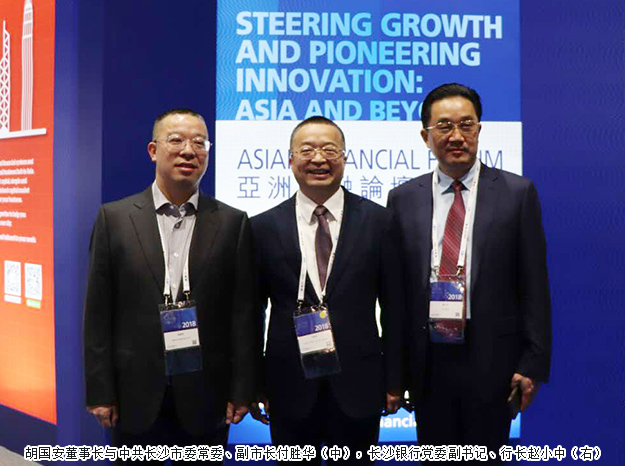 2018年1月15—16日,由香港特別行政區(qū)政府及香港貿(mào)易發(fā)展局共同主辦的“2018亞洲金融論壇”在香港會議展覽中心舉行。中華人民共和國香港特別行政區(qū)行政長官林鄭月娥,香港貿(mào)易發(fā)展局主席羅康瑞,中國證券監(jiān)督管理委員會副主席姜洋;俄羅斯第一副總理舒瓦洛夫,美國第76任財(cái)政部長杰克盧,國際貨幣基金組織第一副總裁大衛(wèi)?利普頓,亞洲開發(fā)銀行行長中尾武彥,盧森堡財(cái)政部長皮埃爾·格拉美亞,亞洲基礎(chǔ)設(shè)施投資銀行行長、董事會主席金立群,匯豐控股有限公司集團(tuán)行政總裁歐智華等100多位來自全球各地的財(cái)金官員、經(jīng)濟(jì)學(xué)家、跨國企業(yè)管理層和財(cái)金專家出席會議。中共長沙市委常委、副市長付勝華,長沙市委組織部副部長張白云,長沙市政府金融辦主任李曉斌等攜長沙市金融代表團(tuán)參加會議。湖南省工商聯(lián)(總商會)副會長、香港湘都同鄉(xiāng)會名譽(yù)會長、香港長沙商會副會長、綠之韻集團(tuán)董事長、綠韻控股集團(tuán)董事局主席胡國安受邀參加會議。