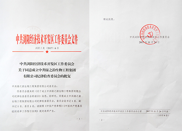 2017年12月19日,中共綠之韻生物工程集團(tuán)有限公司紀(jì)律檢查委員會(huì)成立暨第一屆委員選舉大會(huì)成功召開。會(huì)上,根據(jù)中共瀏陽經(jīng)濟(jì)技術(shù)開發(fā)區(qū)工作委員會(huì)[2017]6號(hào)文件批復(fù),中共綠之韻生物工程集團(tuán)有限公司紀(jì)律檢查委員會(huì)正式成立。會(huì)上選舉并產(chǎn)生了第一屆紀(jì)委班子。綠之韻集團(tuán)常務(wù)副總經(jīng)理胡均安,副總經(jīng)理梅其慧,黨委書記劉云、副書記許達(dá)仲攜各黨支部書記、全體黨員參加會(huì)議。本次大會(huì)還特別邀請(qǐng)了瀏陽經(jīng)開區(qū)黨群工作局科長(zhǎng)李慶參加會(huì)議。