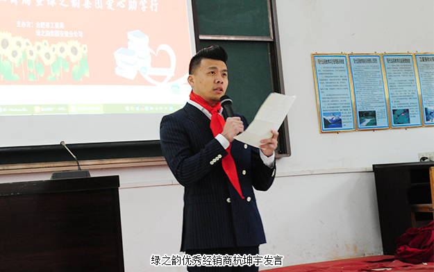 合肥市工商局經(jīng)濟檢查執(zhí)法局副局長梁宏祥上臺發(fā)言。他在發(fā)言中對綠之韻集團“關(guān)愛生命、造福人類”的理念予以了高度的肯定,并希望綠之韻集團能繼續(xù)用切實的行動帶動更多的綠之韻人、更多的企業(yè)和社會公眾,共同幫助社會弱勢群體,弘揚奉獻精神,為構(gòu)建和諧社會傳遞正能量。