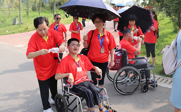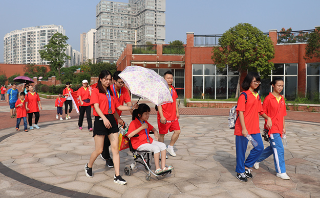 簡短開幕儀式以后,“走長城”(長沙站)公益活動正式開始。來自社會各界的愛心志愿者們從南大門出發(fā),按照指定的路線沿著西湖文化園開始為愛行走。一路上,處處可見穿著統(tǒng)一的紅色公益文化衫的愛心志愿者,他們有的三五成群,奮力競走,好似團隊之間在進行小比拼;有的一家三口全員出動,帶著小孩漫步在西湖畔,沉浸在感知愛、傳遞愛、奉獻愛的氛圍。行走的隊伍中,還有一些借助輪椅、助行器步伐緩慢的孩子,他們是長沙彩虹晨光中心的孤殘兒童。行動不便的他們在志愿者的攙扶與鼓勵中,克服身體障礙,堅毅前行,挑戰(zhàn)5公里行走。行走的愛心志愿者隊伍很快便吸引了不少周邊民眾的廣泛關(guān)注,在此休閑、晨練的民眾們從志愿者處了解到此次公益活動的目的后深受感動,自覺加入到愛心隊伍當(dāng)中,一起為公益行走。