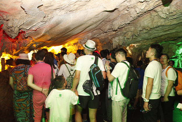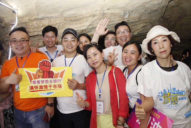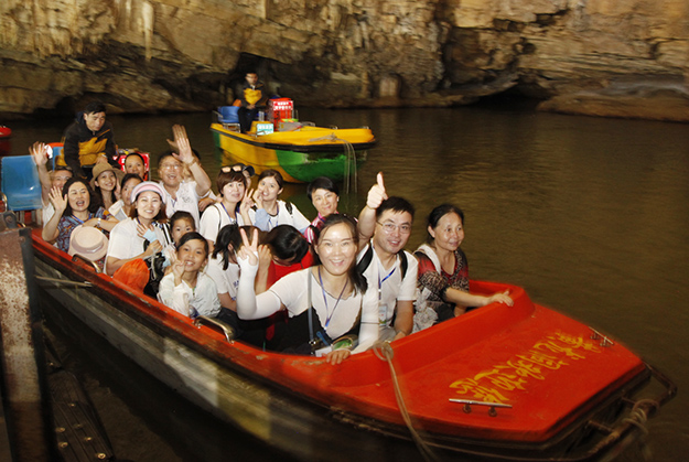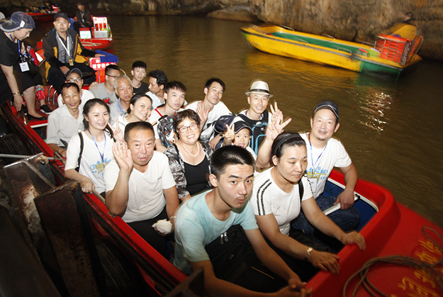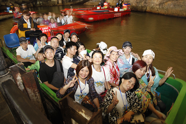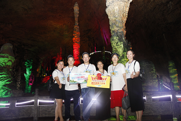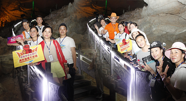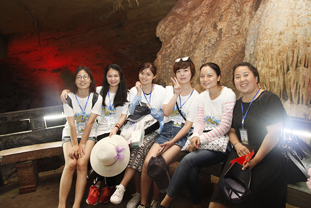 炙陽高照,黃龍洞自然空調(diào)帶來的清涼是送給伙伴們的第一份禮物。黃龍洞是“世界溶洞全能冠軍”,超過10萬平方米的龐大洞穴空間,立體的洞穴結(jié)構(gòu),高大的洞穴瀑布,寬闊的龍宮廳及數(shù)以萬計(jì)的石筍,仿佛一座神奇的地下“魔宮”。綠之韻家人們穿梭其中,無所不奇,無奇不有,深深陶醉在大自然神奇的懷抱里,驚嘆不已。