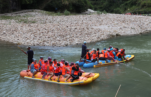 炎炎夏日,伙伴們對(duì)水的渴望更加強(qiáng)烈。張家界旅行的重頭戲便是前往素有“天下第一漂”美譽(yù)的猛洞河漂流,感受與水搏斗的激情和清涼。從“哈妮宮”出發(fā),順?biāo)拢蝗~扁舟,在原始次生林的高山峽谷之中,綠之韻營(yíng)銷精英們身著救身衣、乘皮舟、闖險(xiǎn)灘、博激流,沿途觀美景、沐瀑流、打水仗、過峽關(guān),出沒浪端谷底,激情高漲之時(shí),忍不住放歌長(zhǎng)嘯,戲水嘻鬧,找回快樂童真的自我。