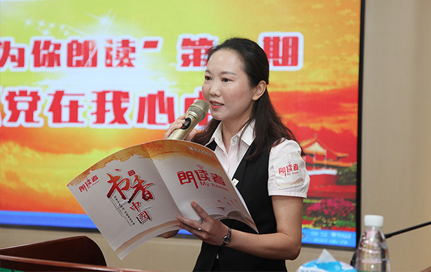 為激發(fā)全員愛黨、愛國、愛崗熱情,著力打造學(xué)習(xí)型企業(yè),2017年6月29日,綠之韻集團(tuán)黨委組織開展了“我為你朗讀”第一期《黨在我心中》活動(dòng)。綠之韻集團(tuán)副總裁劉淑娟、副總經(jīng)理胡均安、綠之韻集團(tuán)黨委書記劉云、副書記許達(dá)仲、綠之韻集團(tuán)總裁助理蔣文受邀擔(dān)任本次比賽評委。來自綠之韻集團(tuán)支部、綠之韻分公司支部、綠之韻國際大酒店支部、綠之韻保健日用品支部的8名選手參加本次朗讀比賽。綠之韻集團(tuán)團(tuán)委書記王壯擔(dān)任主持。