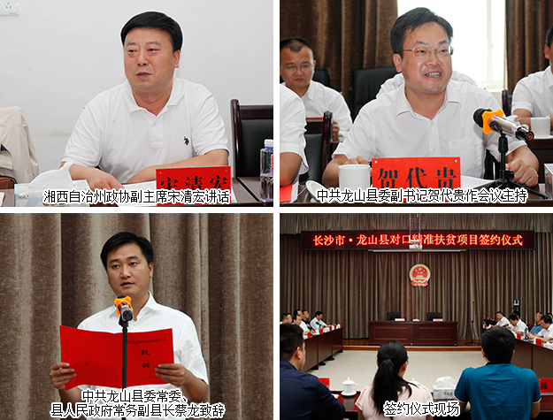 長沙市政協(xié)主席文樹勛在簽約儀式上作重要講話,他指出:近年來,為貫徹國家“精準(zhǔn)扶貧、精準(zhǔn)脫貧”戰(zhàn)略思想,全面落實(shí)中央和省委省政府部署要求,長沙市委市政府以及市直部門主要負(fù)責(zé)同志,先后數(shù)次專程赴龍山縣開展對(duì)口幫扶工作,特別是省會(huì)城市的企業(yè)家們,致富不忘回報(bào)社會(huì),心系龍山脫貧發(fā)展,龍山經(jīng)濟(jì)社會(huì)發(fā)展取得了長足的進(jìn)步、城鄉(xiāng)居民收入發(fā)生了翻天覆地的變化,龍山縣精準(zhǔn)脫貧指日可待。他提出了下一步龍山縣茨巖塘鎮(zhèn)的精準(zhǔn)扶貧工作三點(diǎn)要求:一是要抓好產(chǎn)業(yè)扶持,要把長沙的資金、技術(shù)、管理優(yōu)勢和茨巖塘鎮(zhèn)的資源稟賦和產(chǎn)業(yè)特色結(jié)合對(duì)接起來,扶持一批生態(tài)、文化、民俗產(chǎn)業(yè);二是要抓好項(xiàng)目援建,要突出民生重點(diǎn),解決鄉(xiāng)民的衣食住行首要問題;三是要抓好教育培訓(xùn),扶貧先扶志,多舉辦龍山農(nóng)民致富培訓(xùn)班、加強(qiáng)技術(shù)人員現(xiàn)場指導(dǎo),提高農(nóng)戶種養(yǎng)殖水平,為農(nóng)山人民脫貧致富提供智力支持。