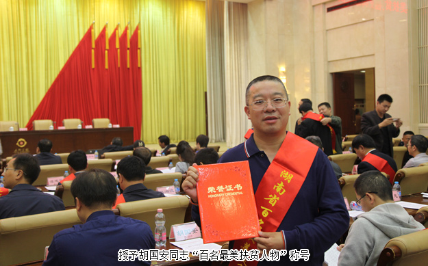 2016年10月15日下午,湖南長沙,“‘扶貧日’宣傳活動暨湖南省脫貧攻堅示范村、最美扶貧人物授牌頒證儀式”在九所賓館會議中心隆重舉行。參加會議的主要領(lǐng)導(dǎo)有湖南省政府副秘書長曹英華,省扶貧辦黨組書記、主任王志群等單位主要負(fù)責(zé)人。綠之韻集團(tuán)董事長胡國安先生被授予湖南“百名最美扶貧人物”稱號,并出席了本次活動。