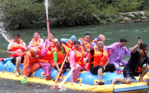 第二站,綠之韻的家人們前往素有“天下第一漂”美譽(yù)的猛洞河漂流,感受與水搏斗的激情和清涼。水槍、水瓢、雨衣等打水仗的“武器”裝備齊全,只見河中水花飛舞、水柱橫飛,還未坐上船伙伴們就紛紛“濕身”了。拐一百五十五個(gè)彎,在一百三十三個(gè)灘潭中穿梭而行,途徑三角巖、雞籠門、落水坑瀑布、夢思峽……綠之韻家人順流而下,在這里放歌長嘯,戲水嘻鬧,找回快樂的自我。