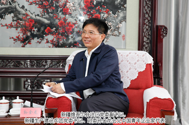 6月18日上午,新疆維吾爾自治區(qū)黨委副書記,新疆生產(chǎn)建設(shè)兵團(tuán)黨委書記、政委孫金龍?jiān)诒鴪F(tuán)機(jī)關(guān)綜合樓會(huì)見了 “中國青年企業(yè)家兵團(tuán)行”經(jīng)貿(mào)考察活動(dòng)的青年企業(yè)家一行。會(huì)見代表有中國青年企業(yè)家協(xié)會(huì)常務(wù)副會(huì)長、共青團(tuán)中央青年發(fā)展部部長楊松, 中國青年企業(yè)家協(xié)會(huì)常務(wù)理事、湖南省青年企業(yè)家協(xié)會(huì)副會(huì)長、綠之韻集團(tuán)董事長胡國安等中國青年企業(yè)家協(xié)會(huì)領(lǐng)導(dǎo)和30名企業(yè)家。新疆建設(shè)兵團(tuán)黨委常委、副政委徐偉華,兵團(tuán)黨委常委、副司令員、秘書長李新明,兵團(tuán)工業(yè)和信息化委員會(huì)黨組書記、主任丁頌國,兵團(tuán)財(cái)務(wù)局黨組書記、局長李萍,兵團(tuán)商務(wù)局黨組書記、局長王多生,兵團(tuán)團(tuán)委黨組書記、書記芮宏等領(lǐng)導(dǎo)參加會(huì)見。