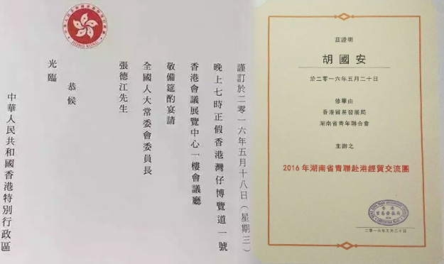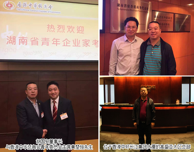 2016年5月16-20日,由湖南省青年聯(lián)合會(huì)和香港貿(mào)易發(fā)展局聯(lián)合舉辦的“2016湘港經(jīng)貿(mào)合作交流會(huì)”在香港會(huì)展中心舉行。共青團(tuán)湖南省委書(shū)記、省青聯(lián)主席湯立斌率湖南企業(yè)家組成的代表團(tuán)赴港參會(huì),并舉辦赴港營(yíng)商培訓(xùn)班。湖南省青聯(lián)副主席、綠之韻集團(tuán)董事長(zhǎng)胡國(guó)安先生赴港考察學(xué)習(xí)。5月18日,由香港特區(qū)政府主辦的“一帶一路”高峰論壇在香港會(huì)展中心舉行,全國(guó)人大常委會(huì)委員長(zhǎng)張德江作“發(fā)揮香港獨(dú)特優(yōu)勢(shì),共創(chuàng)‘一帶一路’美好未來(lái)”的主題演講。代表團(tuán)認(rèn)真學(xué)習(xí)了會(huì)議精神,并就湘港聯(lián)手積極參與“一帶一路”建設(shè)開(kāi)展座談研討。