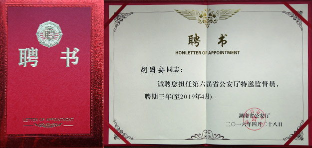 談到再次受聘為湖南省公安廳特邀監(jiān)督員,胡國安董事長(zhǎng)表示: 2008年,我首次受聘為湖南省地方稅務(wù)特邀監(jiān)察員,2012年被受聘為湖南省紀(jì)委、省監(jiān)察廳“機(jī)關(guān)效能建設(shè)和優(yōu)化經(jīng)濟(jì)發(fā)展環(huán)境監(jiān)督測(cè)評(píng)員”,2013年又被受聘為“湖南省公安廳第五屆特邀監(jiān)督員”,對(duì)特邀監(jiān)督員這個(gè)身份始終葆有一種神圣的使命感和責(zé)任感。這個(gè)聘書是沉甸甸的,跟人大代表、政協(xié)委員的身份一樣,不僅是一種光榮,更肩負(fù)著廣大普通民眾的矚托。我一定不辜負(fù)省公安廳黨委的期望,不辜負(fù)廣大民眾的重托,爭(zhēng)做稱職的、優(yōu)秀的監(jiān)督員,并充分發(fā)揮好監(jiān)督、橋梁和參謀作用,為我省公安工作和隊(duì)伍建設(shè)做出自己更大的貢獻(xiàn)。