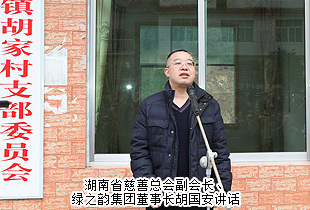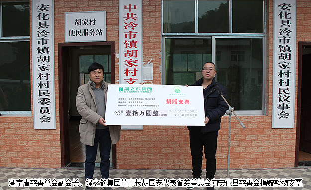 愛心慰問活動上,對胡國安董事長致富思源、支援家鄉(xiāng)建設(shè)的高尚情操,對綠之韻集團(tuán)精準(zhǔn)扶貧、回報桑梓的大愛情懷表示高度的肯定和贊許;安化縣冷市鎮(zhèn)胡家村村支書胡利民簡單介紹了胡家村相關(guān)情況。湖南省慈善總會副會長、綠之韻集團(tuán)董事長胡國安代表湖南省慈善總會向安化縣慈善會捐贈10萬元款物支票,中共安化縣委常委、政法委書記羅必勝向胡國安董事長頒發(fā)了愛心捐贈證書。儀式上,湖南省慈善總會副會長、綠之韻集團(tuán)董事長胡國安發(fā)表了飽含真情的講話。他在發(fā)言中表示,“一個企業(yè)能夠受到政府的關(guān)心、贏得社會的信賴,獲得民眾的尊重,一定離不開對社會責(zé)任的思考、實(shí)踐和擔(dān)當(dāng)。安化胡家村是我的家鄉(xiāng),生我養(yǎng)我的熱土,生命之源,難忘之根。沒有胡家村,就沒有我,沒有綠之韻。我從這里的大山走出去,也想幫助更多人走出大山,過上幸福快樂的生活。綠之韻公益基金會除了繼續(xù)幫扶家鄉(xiāng)建設(shè)水、電、道路和學(xué)校等基礎(chǔ)設(shè)施,還將進(jìn)一步推動輸血式扶貧向造血式、“互聯(lián)網(wǎng)+三農(nóng)”扶貧模式轉(zhuǎn)變,盡最大努力幫助解決安化扶貧的實(shí)際困難,幫助家鄉(xiāng)困難群眾建立脫貧希望,尋找致富方法,使企業(yè)發(fā)展成果惠及更多鄰里鄉(xiāng)親們!”