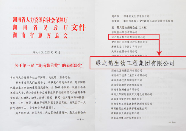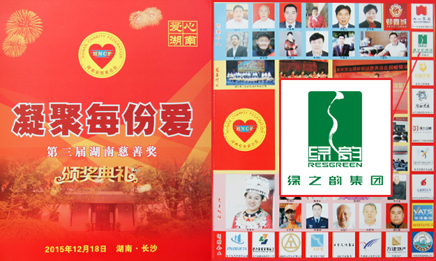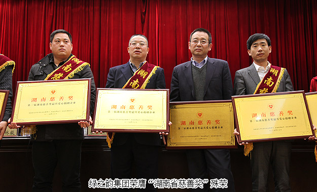 2015年12月18日上午,湖南省慈善總會第三次會員代表大會暨第三屆“湖南慈善獎”表彰大會在長沙舉行。中華慈善總會副會長李宏塔,中華慈善總會秘書長邊志偉,湖南省政協(xié)原主席、省慈善總會第二屆理事會會長王克英,湖南省人民政府副省長蔡振紅,湖南省人民政府副秘書長王光明,湖南省民政廳廳長、黨組書記、省社會組織黨工委書記段林毅,湖南省民政廳巡視員、省社會組織黨工委副書記李勁夫等出席會議。會上,因為在公益慈善事業(yè)中做出的重大貢獻,湖南省工商聯(lián)(總商會)副會長、湖南省光彩事業(yè)促進會副會長、長沙光彩基金會理事長、綠之韻集團董事長胡國安當選湖南省慈善總會副會長;綠之韻集團被湖南省人力資源和社會保障廳、省民政廳、省慈善總會聯(lián)合授予“湖南省慈善獎最具愛心捐贈企業(yè)”殊榮。