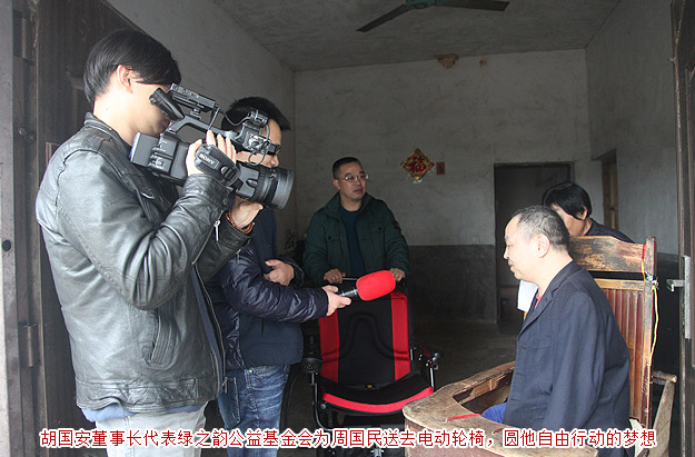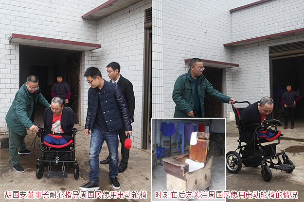 被周國民樂觀自強的精神所感動,綠之韻公益基金會攜手湖南經視《鐘山說事》欄目讓夢想照進現實,幫周國民購置了嶄新的電動輪椅,圓了他的自由行動夢。綠之韻集團胡國安董事長親自將輪椅組裝好,并耐心指導使用。