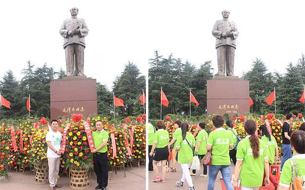 第三站,綠之韻的伙伴們來到了毛澤東銅像廣場,瞻仰偉大的毛主席。毛主席銅像立于高高的紅色花崗巖石基座上,背靠韶峰,主席身軀偉岸,手握書卷,雙眼炯炯有神,面帶微笑地注視著廣場,注視著遠(yuǎn)方,仿佛在歡迎遠(yuǎn)來的客人和世界各地的朋友,主席又似乎停步思考著天下的大事,一派學(xué)者風(fēng)范。廣場上人山人海,來自祖國各地、五湖四海的人們不約而同匯聚在偉人腳下。各色花籃,虔誠鞠躬,深情仰望,每個(gè)人都自發(fā)自覺的用自己的方式懷念著這位偉大的無產(chǎn)階級(jí)革命家,壯志成城的政治家,永垂不朽的理論家。綠之韻集團(tuán)全球營銷中心(中國區(qū))副總經(jīng)理、國際商學(xué)院執(zhí)行院長孫心琥,帶領(lǐng)營銷精英們整齊有序排好隊(duì)列,懷著無比敬仰與懷念,給毛澤東銅像敬獻(xiàn)了美麗的花籃,并恭敬地給毛澤東銅像三鞠躬,然后緩緩地從左往右圍繞毛澤東銅像走了一周,以表達(dá)我們對(duì)一代偉人的深深摯情。