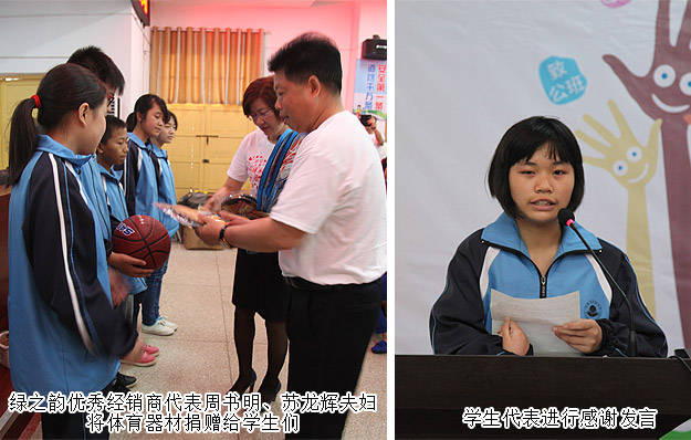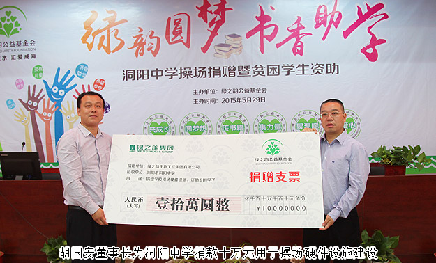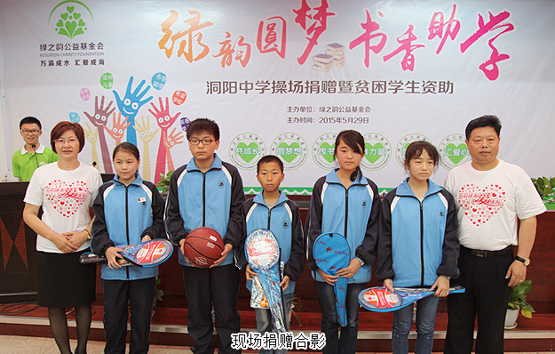 2015年5月28—29日,綠之韻“綠韻圓夢?書香助學(xué)”活動(dòng)走進(jìn)瀏陽洞陽中學(xué)。為了改善青少年教育教學(xué)環(huán)境,共同關(guān)注孩子們健康成長,活動(dòng)當(dāng)天,湖南省光彩事業(yè)促進(jìn)會(huì)副會(huì)長、長沙市光彩事業(yè)基金會(huì)理事長、綠之韻集團(tuán)董事長胡國安先生代表湖南綠之韻公益基金會(huì)向洞陽中學(xué)捐贈(zèng)10萬元愛心款項(xiàng)用于該校愛心操場的建設(shè)。28日上午,湖南綠之韻公益基金會(huì)理事長、董事常務(wù)副總裁勞嘉女士與綠之韻優(yōu)秀經(jīng)銷商周書明、蘇龍輝夫婦一起走訪了學(xué)校貧困學(xué)子的家庭,并給予經(jīng)濟(jì)資助。29日,湖南綠之韻公益基金會(huì)又將一批體育器材親手送到了學(xué)生手中。綠之韻集團(tuán)黨總支部書記許達(dá)仲,湖南綠之韻公益基金執(zhí)行秘書長蔣文,綠之韻集團(tuán)辦公室主任馮紅,瀏陽經(jīng)濟(jì)開發(fā)區(qū)團(tuán)委副書記、綠之韻集團(tuán)團(tuán)支部書記李倩婷,湖南分公司業(yè)務(wù)經(jīng)理劉磊,帶領(lǐng)綠之韻黨團(tuán)成員以及近百位愛心經(jīng)銷商參與活動(dòng)。