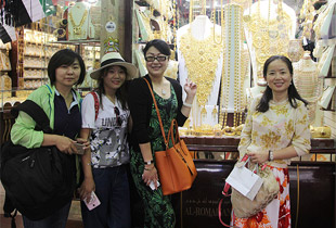 迪拜一度被譽(yù)為黃金城,當(dāng)?shù)氐狞S金亦一度因?yàn)榻饍r(jià)低于鄰近中東各國(guó)而造成大量外流。綠之韻人徹底領(lǐng)略了一把什么叫真正的金碧輝煌。由于阿拉伯人對(duì)黃金情有獨(dú)鐘,所以這里的黃金首飾工藝也特別精致別致,是國(guó)內(nèi)完全沒(méi)法比的,各式夸張的珠寶金飾,你只有在電影里的國(guó)王和皇后身上才會(huì)看到。伙伴們鐘愛(ài)的黃金一起合影,更不忘把看中的心愛(ài)之物收入囊中。