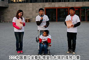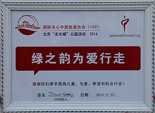 “走長城”活動是國際關(guān)心中國慈善協(xié)會(簡稱ICC)創(chuàng)始人英國義工高永恩先生從2007年發(fā)起的,每年的金秋在加拿大、澳大利亞、英國、美國、新加坡、法國、愛爾蘭、荷蘭、中國香港、長沙、衡陽、三門峽的愛心義工們攜手為孤殘兒童行走。ICC在國外組織的為愛行走活動主要是為中國的孤殘兒童來籌集善款,透過這個活動籌集到的善款挽救了許多孤殘兒童的生命,幫助孩子們有了新的家,有了愛、希望和機會。
