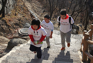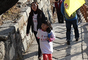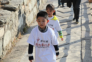 由于行進道路比較狹窄、坡度較大,大家三五成群,從慕田峪長城入口的中華夢石城出發(fā),沿著北步道,一路意志堅定,沿著幾里長陡峭的石階拾級而上,手拉著手歡呼雀躍地向著長城10號炮臺進發(fā)。在這條人流中,匯聚著綠之韻愛心經(jīng)銷商、公務(wù)員、知識分子、企業(yè)老板、務(wù)工人員、學(xué)生……他們彼此并不相識,博愛的名義卻把他們緊緊連在了一起。相識的、不相識的,大家揮舞慈善紅旗,以眼神鼓勁,用微笑問候,朝著一個共同的夢想、共同的愛心、共同的追求徒步前行。共沐大愛的心靈長河,誰人又不被感動呢?