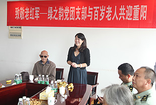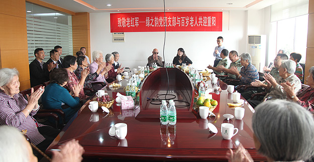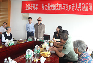窗外的天空涼風(fēng)漸起,而窗內(nèi)的氣氛卻熱情洋溢,在綠之韻的3樓會議室里,“致敬老紅軍——綠之韻黨團支部與百歲老人共迎重陽”的座談會正活躍而熱烈地進行著。勞嘉副總裁首先作了摯情發(fā)言:“值此國慶前夕,重陽來臨之際,湖南省軍區(qū)東湖干休所的老紅軍、老干部,以及瞿所長、謝政委等各位軍官同志蒞臨綠之韻集團參觀、指導(dǎo),是我們無上的榮耀,語言不足以表達我們無比激動、感動的心情,我謹代表綠之韻全體領(lǐng)導(dǎo)及員工,向在座各位老前輩們致以崇高的敬意,你們辛苦了!”并向大家介紹了綠之韻集團所秉持的理念與精神,以及從2006年建設(shè)黨團支部至今所開展的一系列慈善幫扶活動,得到了在座老前輩們的一致嘉許與肯定。