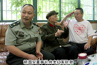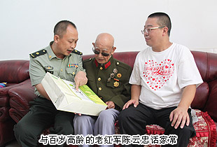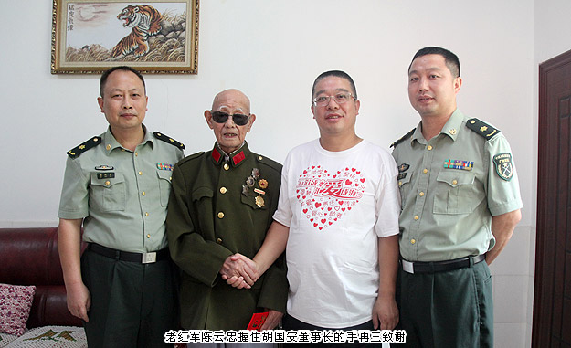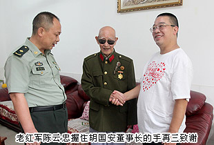 已逾百歲高齡的老紅軍陳云忠家中十分整潔,一面墻上醒目的掛著青年毛主席的肖像。談起革命往事,陳老記憶的閘門被打開,談起革命往事如數(shù)家珍。這位“飛奪瀘定橋”的幕后英雄,有一次夜行軍就磨破了一雙新鞋,他說勝利就是一步步爭取得來的。可別看陳老身體好,他也受過傷痛的折磨,“大傷小傷都受過,有一塊彈片在身體里呆了10多年。”1939年,陳老參加著名的黃土嶺戰(zhàn)役時,敵人的一個小鋼炮打過來,一塊彈片穿進(jìn)了他的右肩。由于醫(yī)療條件有限,陳老的肩膀當(dāng)時只進(jìn)行了一些簡單的消炎處理,這塊彈片直到1951年才取出。當(dāng)大家詢問起老人的身體時,老人舉起手來十分自豪說:“我還能自己做飯呢。”而看到胡國安董事長送上的慰問品和慰問金后,老人頗有些羞澀,感觸的說:“謝謝你們對我的關(guān)心,我一切都好!”