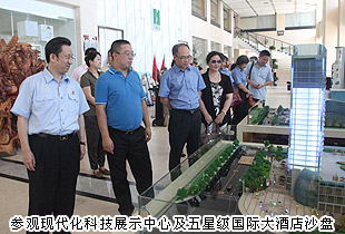 考察過程中,各位領導首先參觀了綠之韻集團辦公大樓。從企業(yè)文化展區(qū)、現(xiàn)代化科技展示中心及五星級國際大酒店沙盤,到產(chǎn)品展示廳、黨團工作展示區(qū)……長沙市中級人民法院副院長黎軍、長沙市人民檢察院副檢察長祝珍明、長沙市僑聯(lián)主席翁少蘭等領導在胡國安董事長的陪同下,邊走邊看,仔細詢問,不時點頭稱贊。
