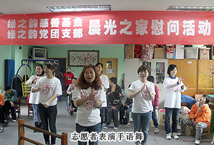 在對中心電腦課程、康復(fù)課程、語言課程等進(jìn)行了解后,一行人來到一樓大廳,看望了經(jīng)過專業(yè)治療、康復(fù)訓(xùn)練,已經(jīng)能說能唱、思維接近正常孩子的兒童們。看到志愿者的到來,孩子們也開心地用發(fā)音不是很準(zhǔn)的語音和大家打起了招呼,并為現(xiàn)場表演起精心準(zhǔn)備的自編自演的舞蹈來。看著孩子們經(jīng)過訓(xùn)練,協(xié)調(diào)而充滿韻律的舞蹈,以及臉上所透露出的幸福而滿足表情,勞嘉會心地笑了。綠之韻的志愿者們也表演了節(jié)目:手語舞“讓愛傳出去”,精彩的手語舞讓現(xiàn)場一下安靜起來。爾后,ICC長沙區(qū)域辦公室主任李明對綠之韻集團(tuán)慈善基金與綠之韻黨團(tuán)組織表示了衷心感謝。綠之韻集團(tuán)董事常務(wù)副總裁,綠之韻慈善基金常務(wù)理事長勞嘉隨后也簡短致辭,為孩子們送上關(guān)懷與祝福。